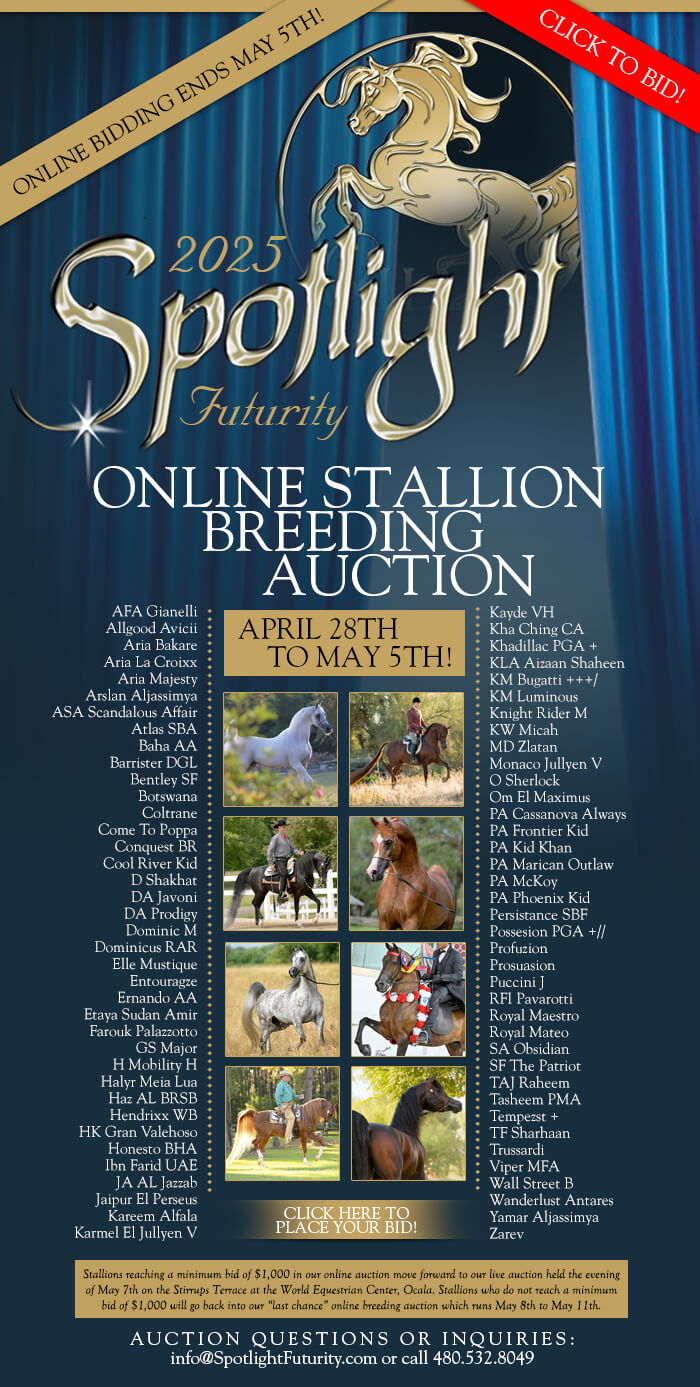 The 2023 US Nationals was a pivotal moment for Coltrane’s breeding career. His progeny were named both United States National Champion and Reserve National Champion in one of the most prestigious classes of the show, the Arabian English Pleasure Futurity: Songwriter CA, National Champion with Joel Kiesner for owner Candace Avery and Rubi Slippers, Reserve National Champion with Lance Lewis for owner/breeder Strawberry Banks Farm.