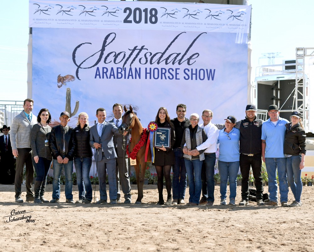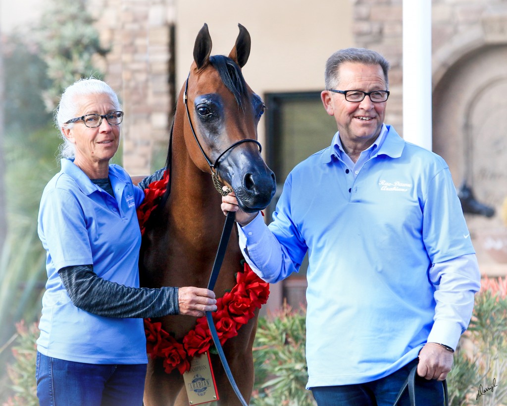 Both Murray and Shirley had big wins in amateur halter competition at Scottsdale, with Murray Popplewell bringing home the 2018 Scottsdale Champion Mare AAOTH title with RD Magic Moments (Bey Ambition x GF Simply Magic)—the second time in a row it has been won by Bey Ambition offspring! Reserve Champion Mare in the class went to Shirley Popplewell and RD Lavinya (Marwan Al Shaqab x RD Marciena). In the previous year, the Scottsdale Champion Mare AAOTH was RD Siena Serenade (Bey Ambition x NW Siena Psyche).