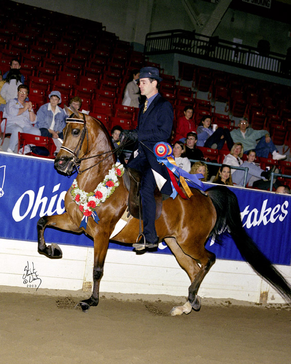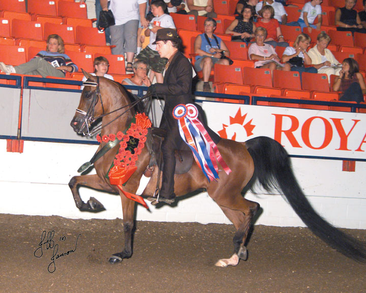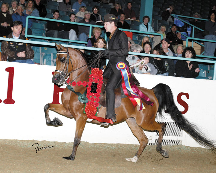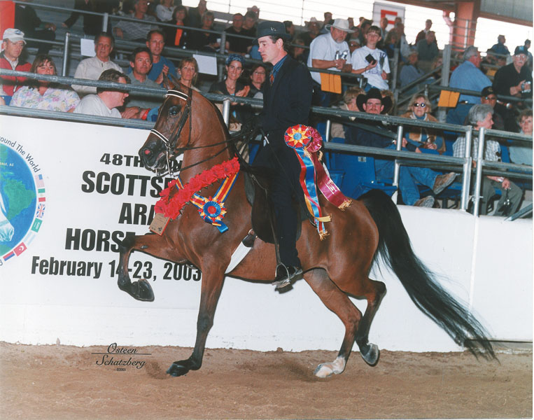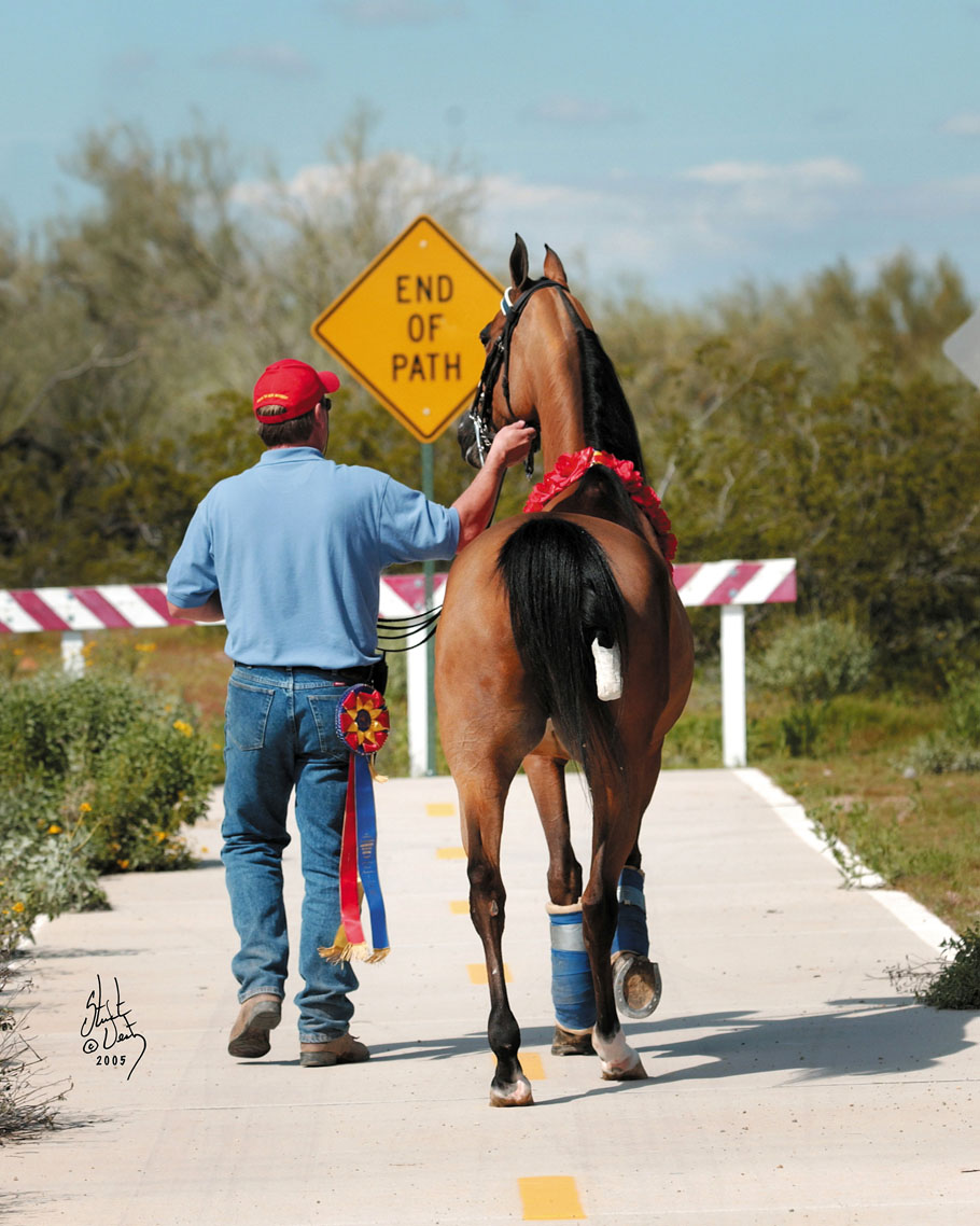“Making the mare movement” has been a phrase coined by Steve and is clearly understood by the Arabian horse industry who have come to assimilate it with Rumina Afire+, especially the breeders of English horses and those with a penchant for breeding extreme English Pleasure predictability. Rumina Afire has had foals sired by VJ Royal Heir, IXL Noble Express, HF Mister Chips, Sir William Robert, Majesteit, A Temptation, Undulatas Nutcracker, H Mobility H, and the reigning World Champion Nutcracker’s Nirvana.