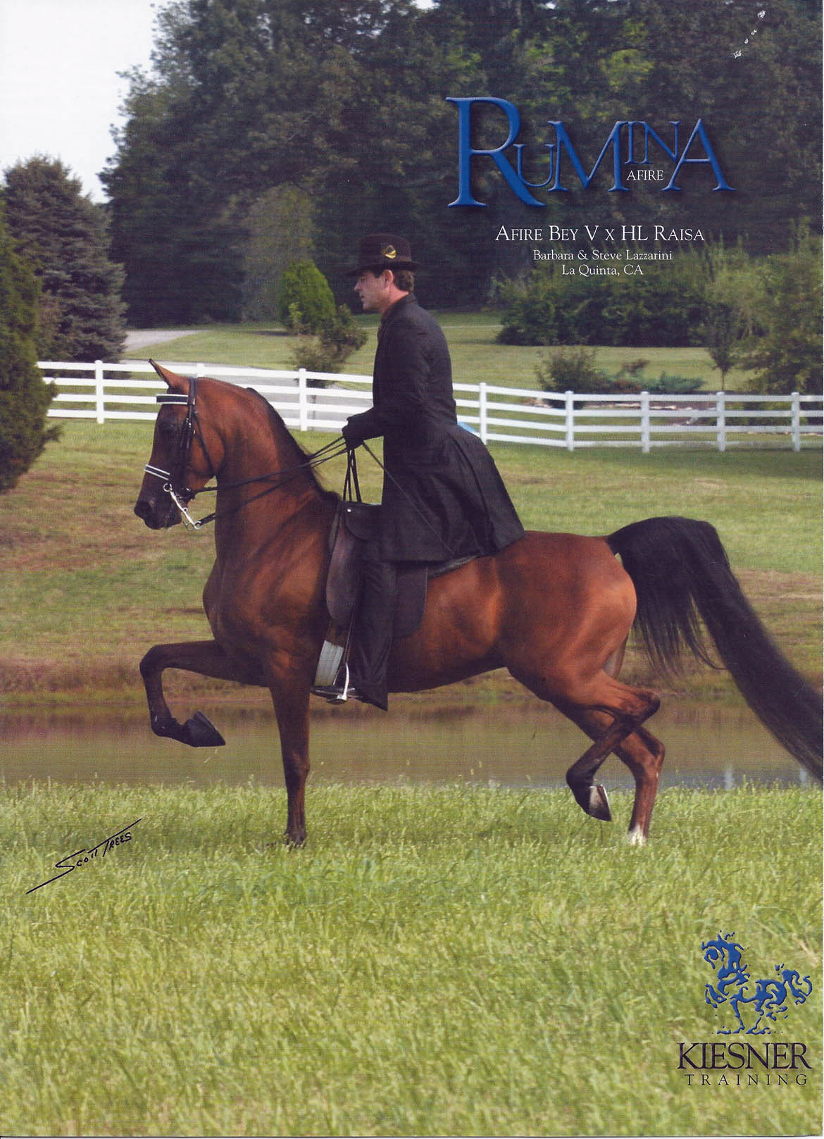 Steve and Diana Lazzarini own the BL Ranch Arabians in Indio, California — nestled just outside of Palm Springs, 90 minutes East of Los Angeles. The quaint desert landscaped farm sits on 5 acre desert acres and houses some of the most exciting Arabian and Half-Arabian English horses in the country and of course being home to the queen herself, Rumina Afire. Rumina’s incredible show career was orchestrated by the talents of Joel Kiesner back East in Louisville, Tennessee. Joel and his wife Ashton own and operate Kiesner Training and house an incredible group of English show and breeding horses. Joel’s meticulous horsemanship and eye for detail was a match made perfect for Rumina. Together, the pair amassed an undefeated show record in 2003 winning the “Triple Crown” in Arabian Country English Pleasure; United States National Champion, Canadian National Champion, Scottsdale Champion, and of course not to leave out her being crowned champion at the very competitive and prestigious Ohio Buckeye Sweepstakes Championships. Rumina’s last showering appearance was in 2005 when she was Unanimous Champion at Scottsdale