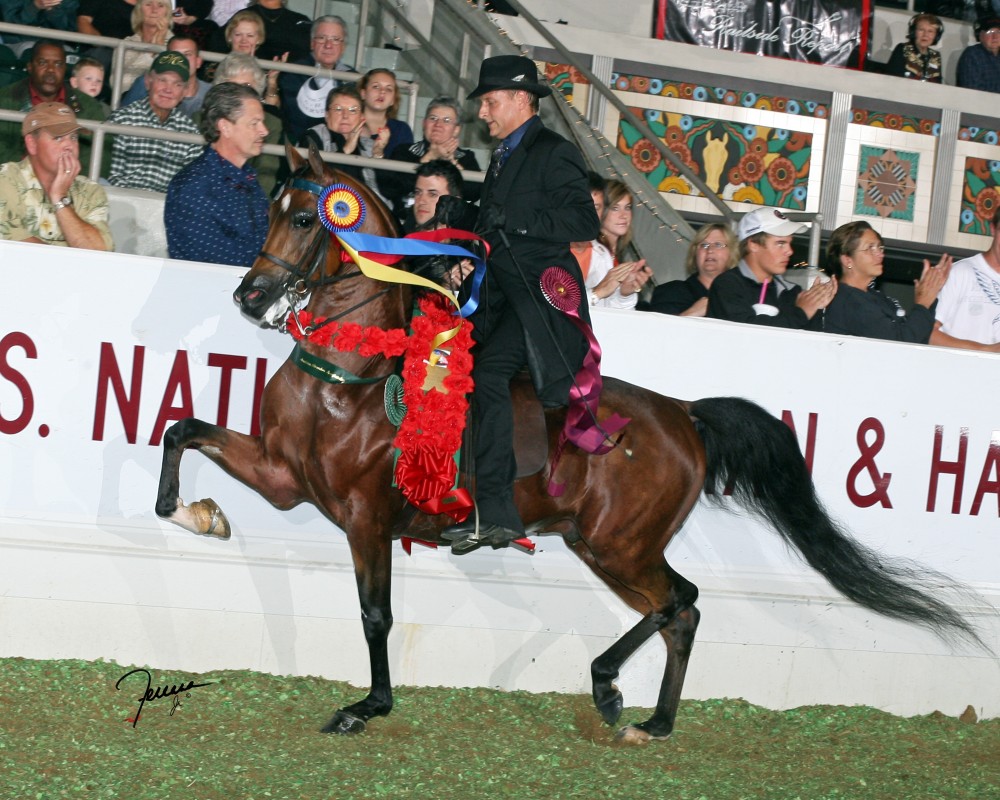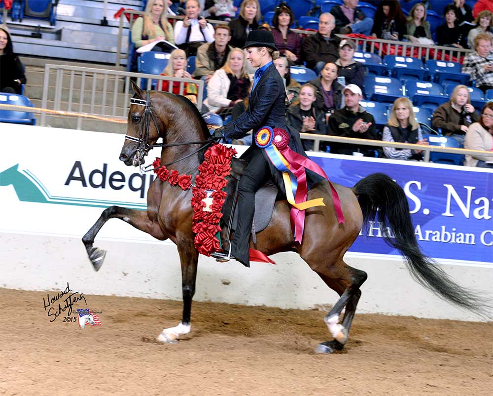 The cheers from the crowd were deafening as the judges at the 2010 United States National English Pleasure Championship called for a work-off between the top two competitors. Vegaz had won the 2006 U.S. National Champion English Pleasure Futurity title and was also the unanimous 2008 English Pleasure Junior Horse. Going head- to-head against him was the reigning 3-time unanimous champion Afires Heir in his show ring finale. In a final round that is remembered as the best of all time, Vegaz pushed his nemesis to the limit and secured the title of Reserve National Champion. That 2010 work-off remains one of the most talked-about moments in Arabian show horse history. It was not only a display of awesome talent; it was a glimpse into the future, as both stallions have emerged as significant sires of national performance champions formed in their own image. With 553 registered foals, Afires Heir has an enviable pool to pull from. But, with only 185 get of his own, Vegaz can claim an equal or better percentage as a sire. Just one year after the memorable final, Vegaz (Apollopalooza x SMS Forever Bay) had his first national title-winner in CSP Mister Vegaz, the 2011 U.S. Reserve National Champion Half-Arabian Country English Pleasure Futurity horse bred by trainer Chris Wilson. That was just the beginning. To date, Vegaz has sired 23 individual horses who have earned 54 National Champion and Reserve titles (U.S., Canada, Youth). At times, his influence at the top is staggering.